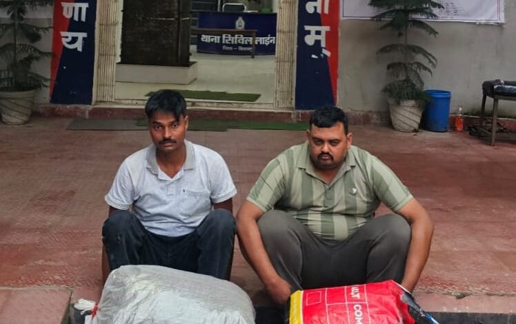 बिलासपुर– न्यायधानी की पुलिस ने दो अंतरराज्यीय गांजा तस्करों को गिरफ्तार करने में सफलता हासिल की है.. वरिष्ठ पुलिस अधीक्षक रजनेश सिंह (भा.पु.से.) के निर्देश पर नशे के अवैध कारोबारियों के विरुद्ध अभियान चलाया जा रहा है.. इसी क्रम में आज ए.सी.सी.यू. एवं थाना सिविल लाइन की टीम को उसलापुर रेलवे स्टेशन के पास संदेहास्पद गतिविधियों की सूचना प्राप्त हुई, कार्रवाई के दौरान दो व्यक्ति पुलिस को देखकर भागने का प्रयास करने लगे, जिन्हें पकड़कर पूछताछ की गई.. संदेही रूपेश सिंह ने भारतीय सेना का एक पहचान पत्र दिखाकर पुलिस को गुमराह करने की कोशिश की.. किंतु उसके हावभाव एवं पुलिस की सतर्कता से यह स्पष्ट हो गया कि उक्त आईडी फर्जी है..