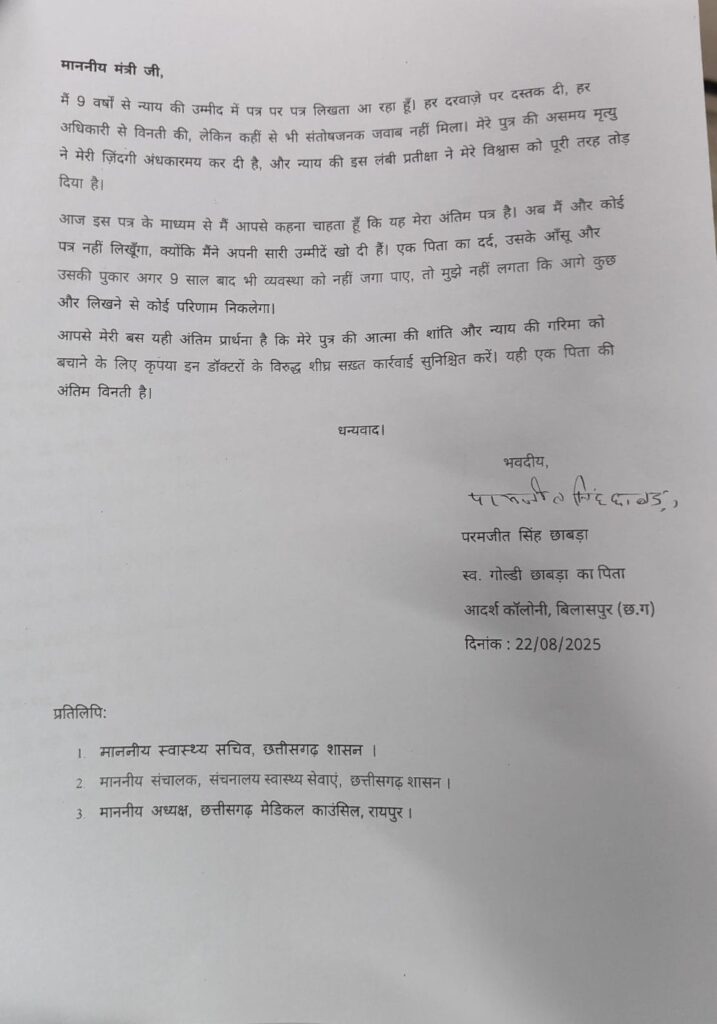 बिलासपुर– अपोलो अस्पताल बिलासपुर में 26 दिसंबर 2016 को हुई गोल्डी छाबड़ा उर्फ गुरवीन सिंह छाबड़ा की मौत के मामले ने एक बार फिर सुर्खियां बटोरी है.. परिजनों का आरोप है कि, डॉक्टरों की घोर लापरवाही से गोल्डी की जान गई, लेकिन नौ साल बाद भी दोषियों पर कोई सख्त कार्रवाई नहीं हुई.. गोल्डी के पिता परमजीत सिंह छाबड़ा ने अब स्वास्थ्य मंत्री श्याम बिहारी जायसवाल को एक “अंतिम पत्र” सौंपा है, पत्र में उन्होंने लिखा है कि, बेटे की मौत के बाद से वे लगातार न्याय के लिए हर दहलीज पर गुहार लगा रहे हैं, लेकिन आज तक केवल आश्वासन ही मिला है..