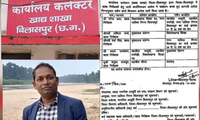 बिलासपुर कलेक्टर संजय अग्रवाल द्वारा जारी आदेश में जिले के खाद्य निरीक्षकों की कार्यक्षेत्र में बदलाव किया गया है..